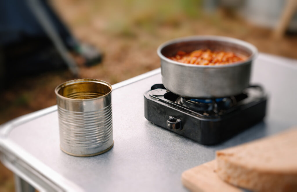 Auch wenn es verlockend aussieht, sollte man Dosen niemals direkt auf den Gaskocher oder ins Lagerfeuer stellen. Das hat mehrere Gründe – zum einen sind die meisten Dosen nicht sehr stabil, sodass sie leicht am Kocher umfallen könnten. Da es keinen Griff gibt, besteht außerdem Verbrennungsgefahr beim Handling. Viele Dosen sind zudem innen beschichtet, zum Beispiel mit Stoffen auf BPA-Basis, die sich bei starker Hitze lösen können. Diese Stoffe stehen im Verdacht, gesundheitlich problematisch zu sein – wie ein Bericht der europäischen Behörde für Lebensmittelsicherheit aufzeigt. Besser ist es, den Inhalt in einen Topf oder eine Pfanne umzufüllen, auch wenn das einen zusätzlichen Abwasch bedeutet.